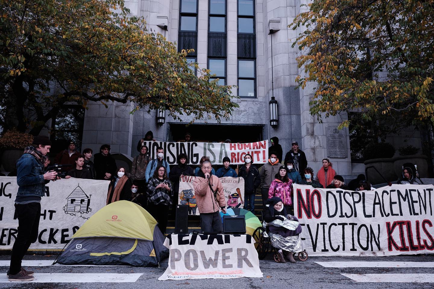 Vancouver Tenants Union members rally with people living in a tent encampment on Hastings Street in a photo shared on Nov. 19, 2022. Credit: Vancouver Tenants Union/Facebook